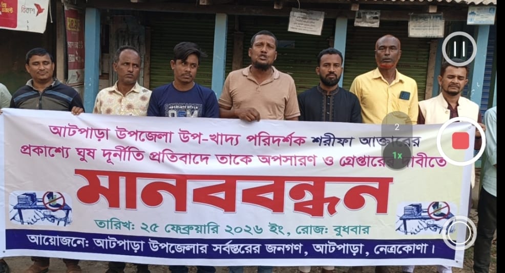 আটপাড়ায় উপ-খাদ্য পরিদর্শকের অপসারণ ও গ্রেপ্তারের দাবিতে মানববন্ধন