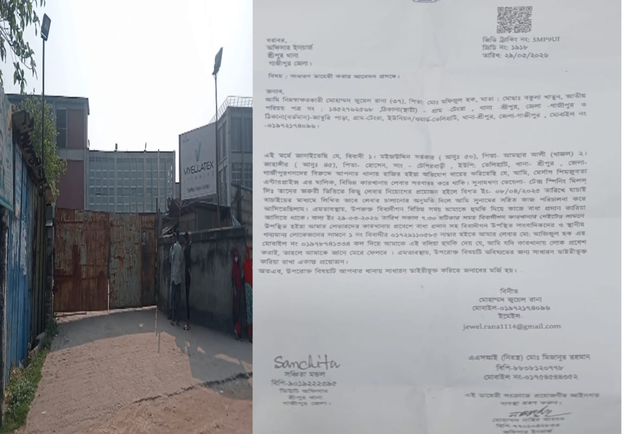 শ্রীপুরে ভেয়েলা-টেক্স স্পিনিং মিলস লিমিটেড’- শ্রমিক সরবরাহে বাধা ও প্রাণনাশের হুমকি: থানায় জিডি