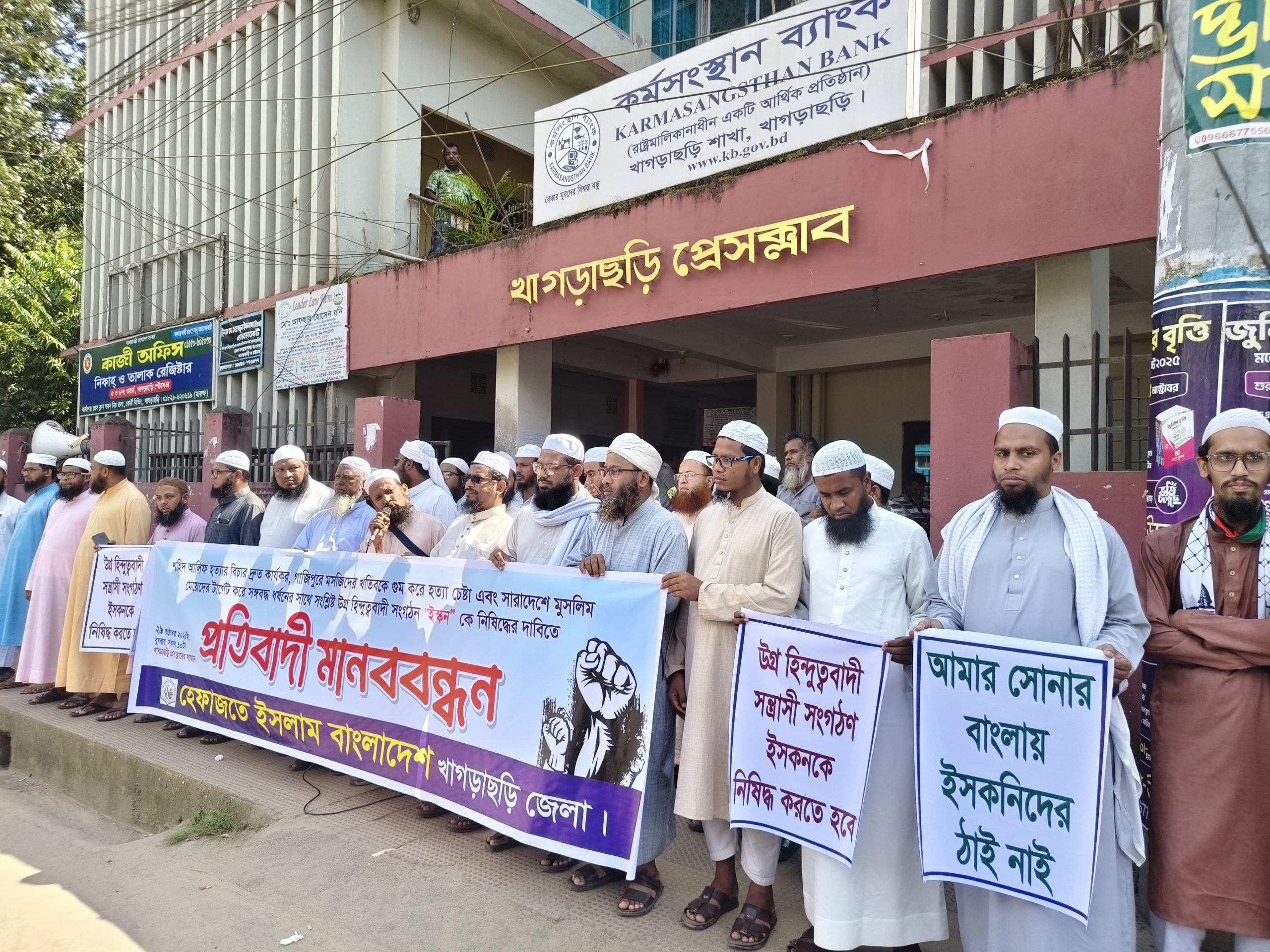 উগ্র হিন্দুত্ববাদী সংগঠন “ইসকন” নিষিদ্ধের দাবিতে মানববন্ধন করেছে হেফাজতে ইসলাম বাংলাদেশ খাগড়াছড়ি জেলা শাখা। বুধবার সকালে খাগড়াছড়ি প্রেসক্লাবের সামনে এ মানববন্ধন অনুষ্ঠিত হয়।