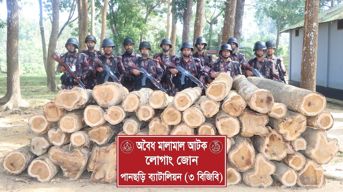 খাগড়াছড়ি জেলার পানছড়ি উপজেলার শুকনাছড়ি এলাকা থেকে অবৈধভাবে কর্তনকৃত বিপুল পরিমাণ সেগুন কাঠ জব্দ করেছে ৩ বিজিবি (লোগাং জোন)–এর সদস্যরা।