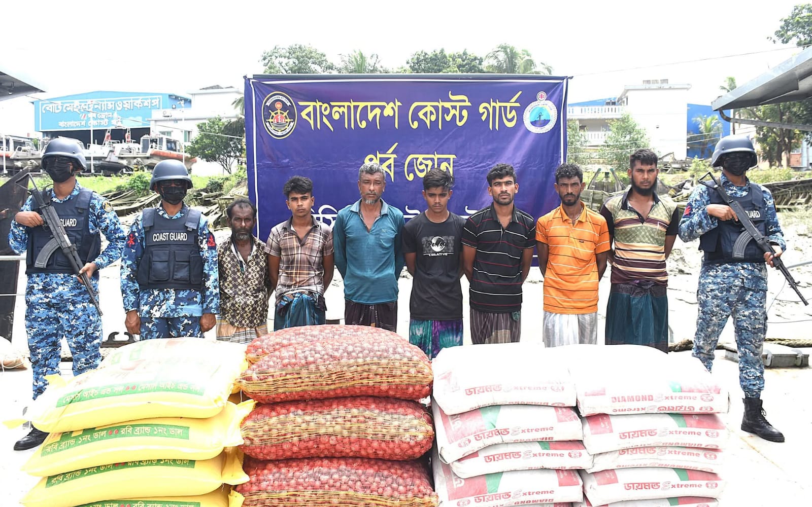 কোস্ট গার্ড অভিযানে মায়ানমার হতে মাদকের বিনিময়ে পাচারকালে বিপুল পরিমাণ বাংলাদেশি সিমেন্ট ও খাদ্য সামগ্রীসহ ৭ জন পাচারকারীকে আটক