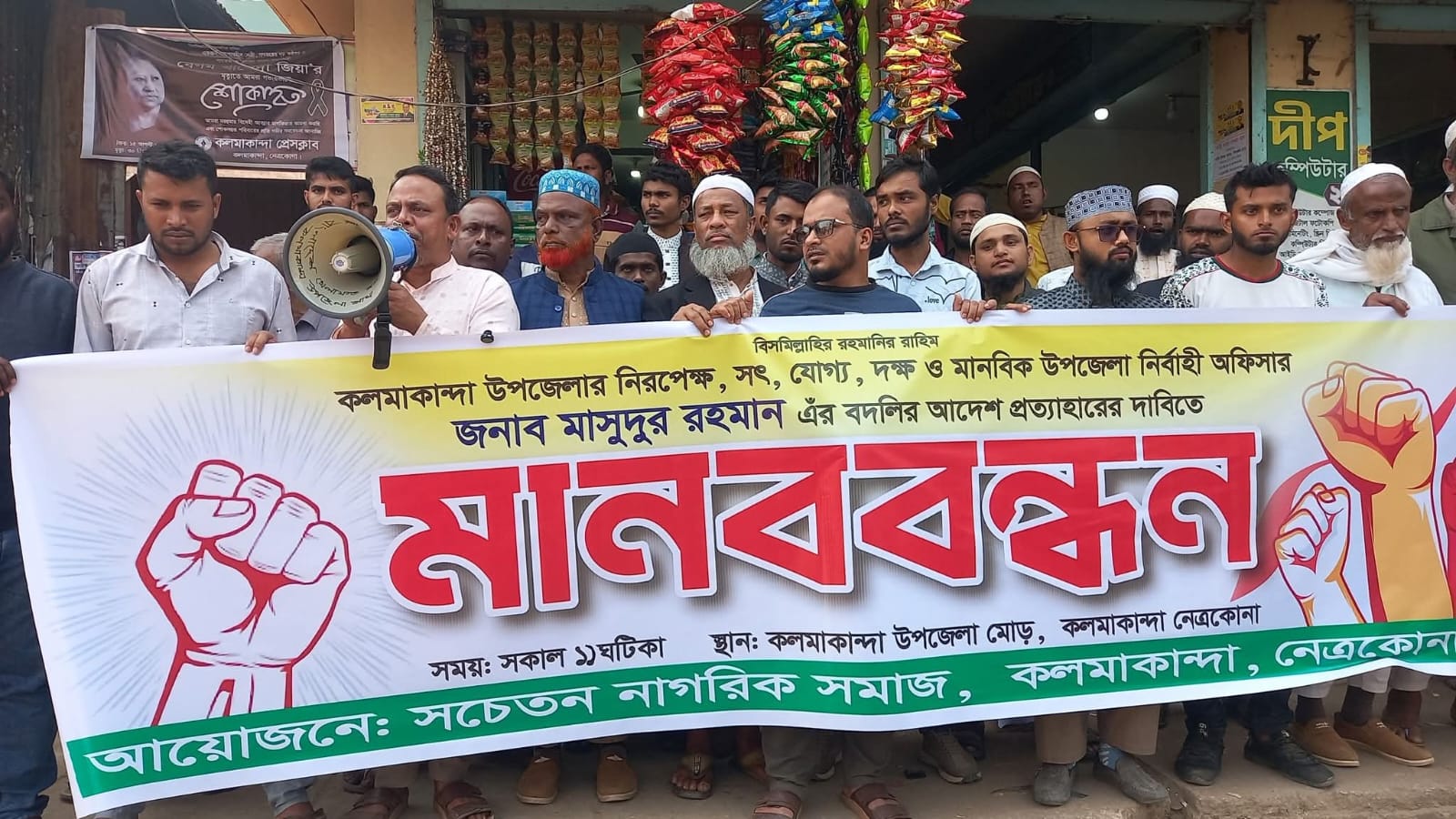 কলমাকান্দায় ইউএনও মাসুদুর রহমানের বদলি প্রত্যাহারের দাবিতে মানববন্ধন