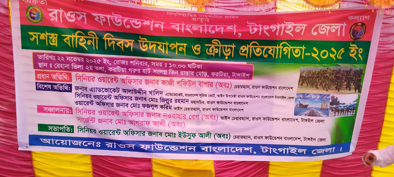 ভ্রাম্যমাণ প্রতিনিধিঃ মোঃ আমান উল্লাহ আমান বাংলাদেশ সশস্ত্র বাহিনী দিবস উদযাপন উপলক্ষে, রাওস ফাউন্ডেশন বাংলাদেশ টাঙ্গাইল জেলা শাখার উদ্যোগে