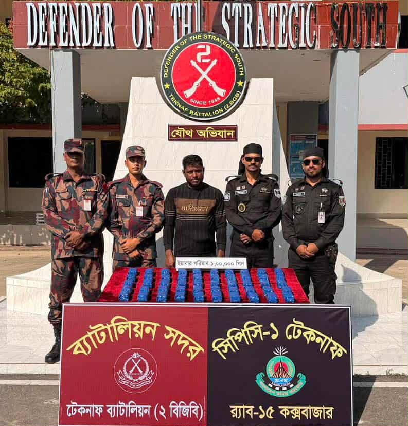 টেকনাফে লম্বরী ঘাটে বিজিবি ও র্যাব-১৫ এর যৌথ অভিযানে ১ লক্ষ ইয়াবাসহ প্রাচারকারী গ্রেফতার ১ জন।